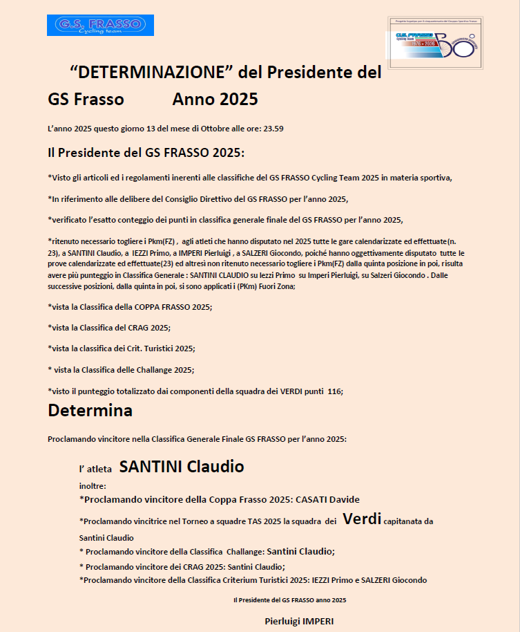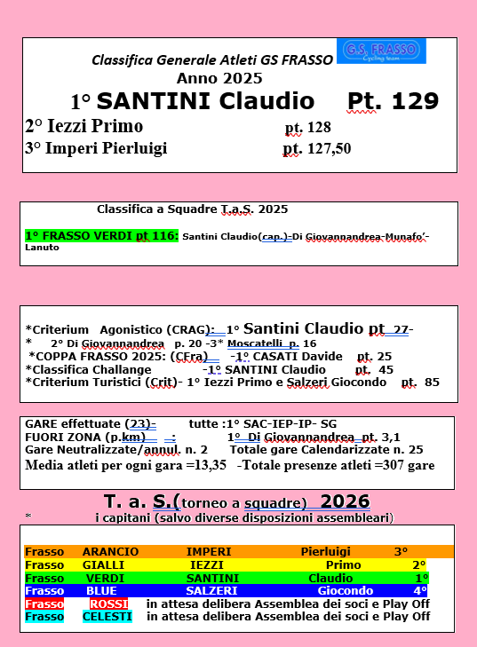 Classifica Finale 2023 Classifica Finale 2022 Classifica Finale 2021 Classifica Finale 2020 Classifica Finale 2019 © www.gsfrasso.net ::: Tutti i diritti riservati - Vietata la riproduzione anche parziale ::: e-mail